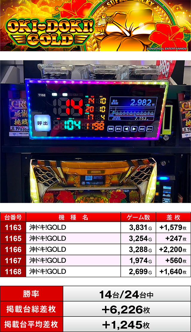 『沖ドキ!GOLD』コーナーからは、プラス台が5台並んで出現。いつも盛り上がりを見せている同機だが、この日は3,000枚超えの記録には出会えず…。しかし偶然とは思えないこの状況に何かしらの思惑を感じ取ったユーザーがいたかもしれない。