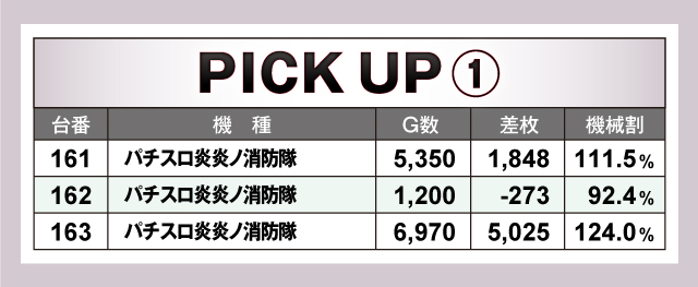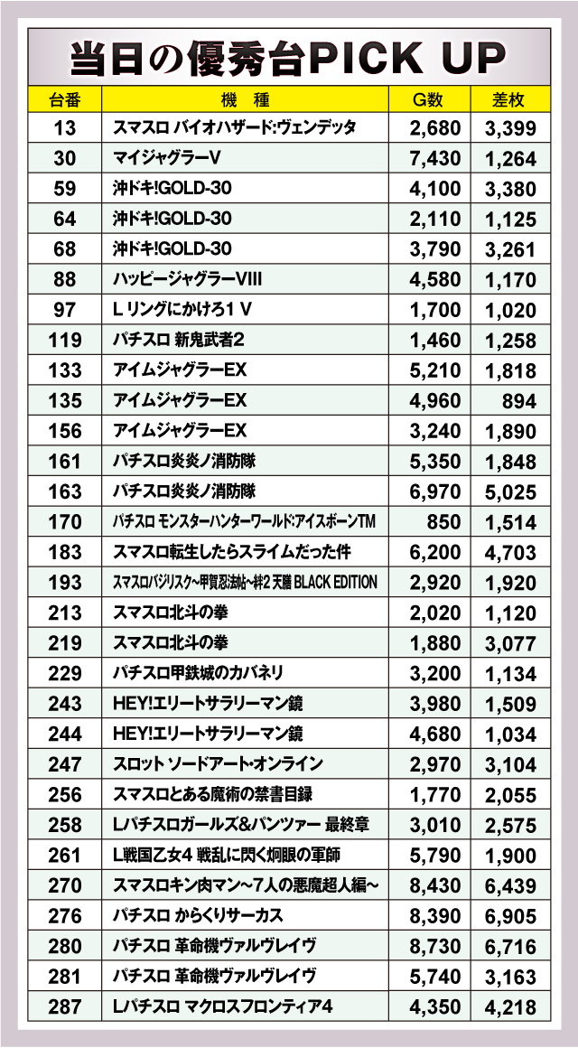 まずは優秀台30台の紹介から。30台のうち14台が+2,000枚オーバーで、+3,000枚オーバーは12台出現! それらのなかでもっとも優秀だったのは、276番台の「パチスロ からくりサーカス」で、差枚+6,905枚を獲得! またランクイン機種を詳しく見てみると、スマスロはもちろん、6.5号機やノーマルタイプなど多種多様な機種がランクイン。特定機種に固めていたというよりは、多くの機種に楽しめる環境を整えていた可能性が高そうだ!