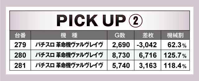続いては、当日3台並びでとくに盛り上がっていた2箇所を紹介。どちらもトータルプラスで終了しており、平均差枚も+2,000枚以上と上々の好結果! なかでも279番台〜281番台の「パチスロ 革命機ヴァルヴレイヴ」の3台並びは、2/3台がプラス終了の平均差枚+2,279枚と素晴らしい結果をマーク! 次回以降同店で遊ぶ際は、並びに注目して立ち回ってみよう!