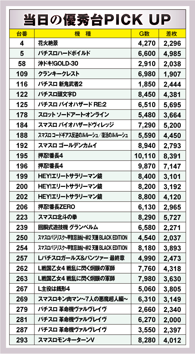 まずは優秀台30台を紹介。30台のうち29台が+2,000枚以上を達成し、さらに+3,000枚以上が18台、+5,000枚以上が5台出現。その中でも特に優秀だったのは195番台の「押忍!番長4」で、差枚+8,391枚を記録し最優秀台となった。優秀30台全体を見渡すと、「HEY!エリートサラリーマン鏡」が3台ランクインするなど、多様な機種が好成績を収めていた。