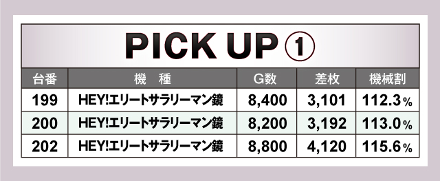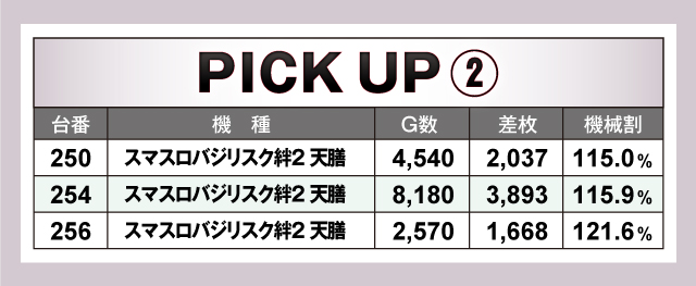 続いては、当日とくに店内を盛り上げた2機種を紹介していこう。まず「HEY!エリートサラリーマン鏡」は、ピックアップ3台全てが+3,000枚以上を記録し、平均差枚は+3,471枚とバツグンの好成績! また「スマスロバジリスク~甲賀忍法帖~絆2 天膳 BLACK EDITION」も好調で、平均差枚+2,533枚とこちらも大いに活躍してくれた!