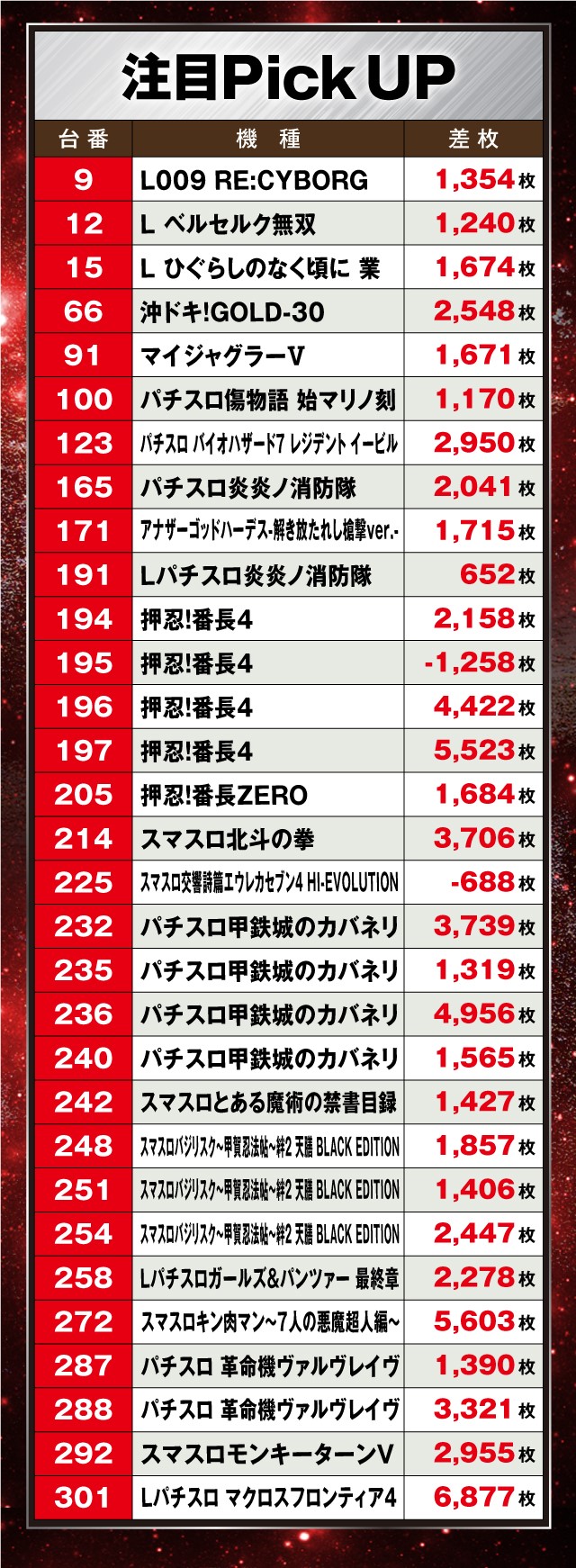 なかでも『押忍!番長4』が4台並びで注目を集めており、平均+2,711枚と機種のポテンシャルを上手く引き出していた。