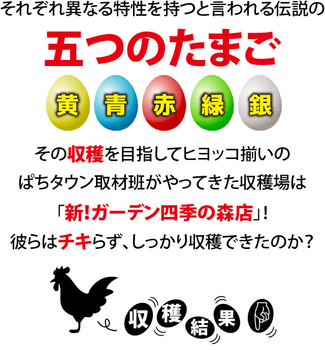今回「新!ガーデン四季の森店」にて五つのたまご全てを収穫することに成功!中でも最もいい状態だったのは「青のたまご」と「銀のたまご」。どちらからもノドから手が出るほどの好結果が生まれており、常連さんも大満足の結果だったはず。記念すべき初回からさっそく全てのたまごを収穫できた以上、次回も同じくらいの収穫量じゃないと常連さんは納得しない!