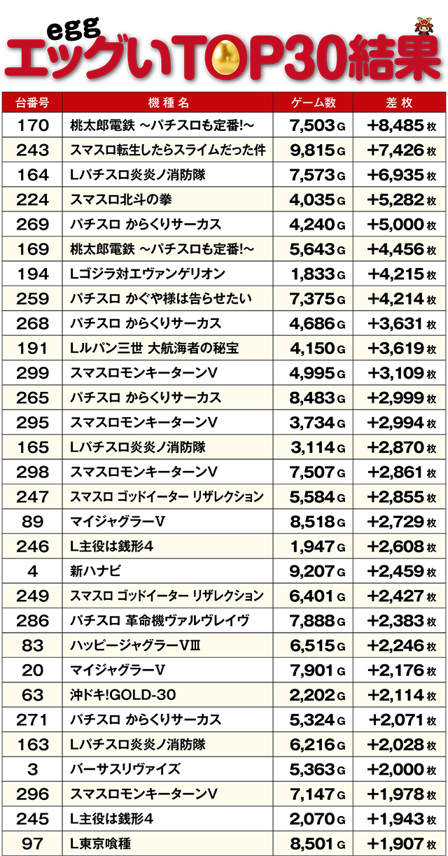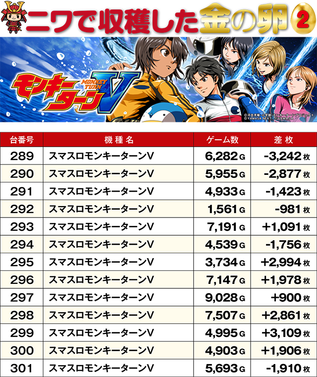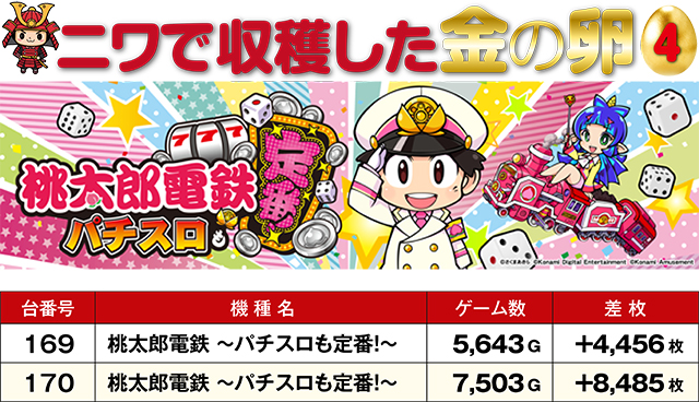 2月2日の鮮烈デビューからわずか6日、さっそく2回目のニワ獲り合戦が実施された。今回は『桃太郎電鉄 ~パチスロも定番!~』と『スマスロ転生したらスライムだった件』が1・2フィニッシュを飾る波乱の結果。さらに毎回仕掛けが見える『スマスロモンキーターンV』に加え、期待以上の動きを見せた機種もいくつかアリ。金の卵たちが今回もハイレベルな結果を残してくれた。