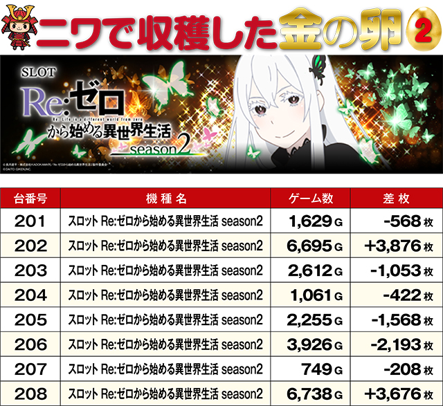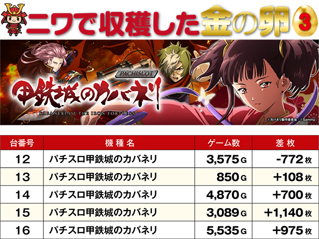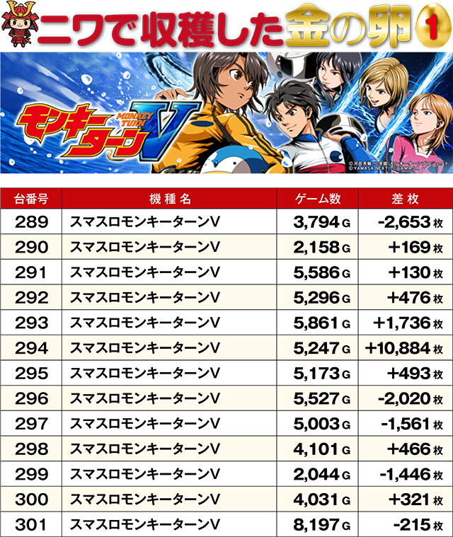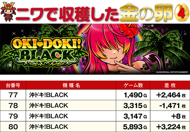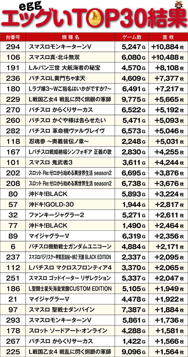 10,000枚オーバー台が2台も飛び出したこの日。TOP30レコードの激しさもさることながら、金の卵ともいうべき記録が、4つの機種から生まれていた。残念ながら総ゲーム数が少なく、マイナスとなってしまった台もあるが、5,000G以上回された台のプラス率は極めて高い数値に。次回はどの機種が金の卵に…!?