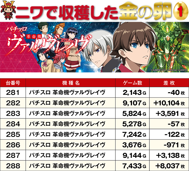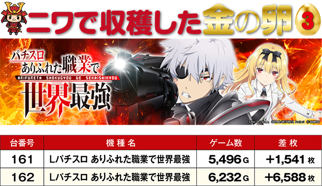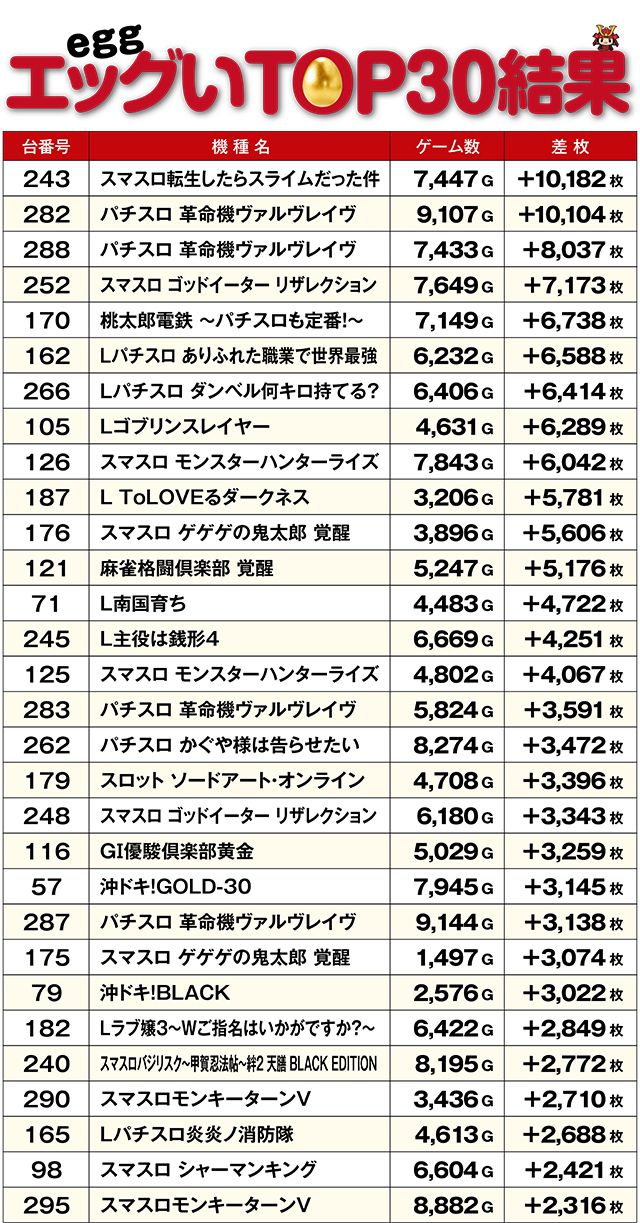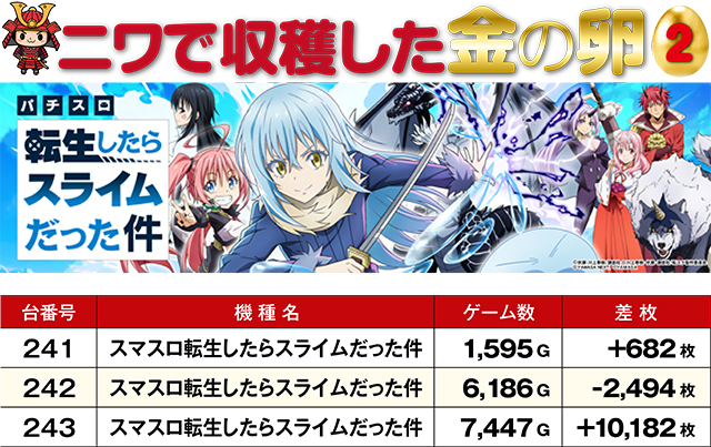 今回は10,000枚オーバー台が2台も出現!それだけに留まらず、勝率5割で両極端な結果となった『パチスロ 革命機ヴァルヴレイヴ』&『スマスロ モンスターハンターライズ』にはバレバレの仕掛けの痕跡が見えていた。また、『スマスロ転生したらスライムだった件』『Lパチスロ ありふれた職業で世界最強』『マジカルハロウィン8』の3機種に至っては、その結果から全台にチャンスがあった気配がプンプン…。次回はどの機種が金の卵に…!?