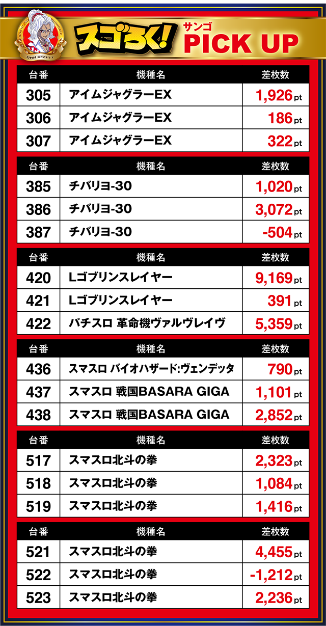 「スマスロ北斗の拳」からは、517番台から519番台、521番台から523番台までの2ヶ所をセレクト。