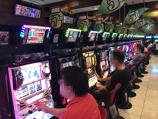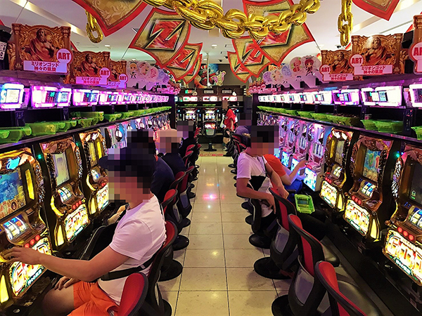 ジャグラーシリーズなどボーナスタイプも盛況。ほかに比べて女性プレイヤーの姿も多く見受けられ、シンプルな告知を楽しむ姿があった。