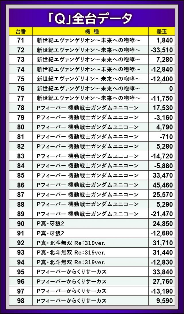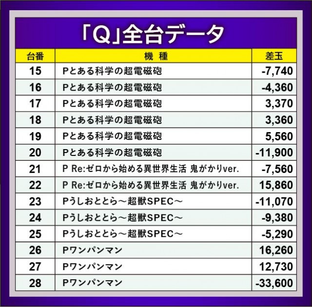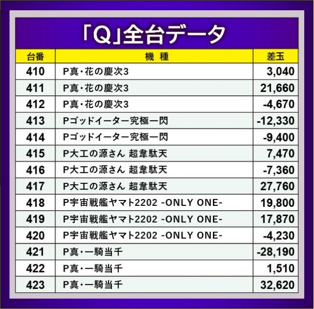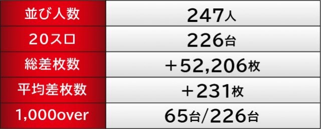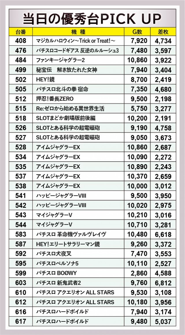 優秀台30台をチェックすると、13台が万回転OVERを達成している。それだけファンの期待が高く、また同店も準備を整えていたのだろう。差枚数に着目してみると、『パチスロ 革命機ヴァルヴレイヴ』583番台+6,618枚や『パチスロ 新鬼武者2』603番台+6,812枚といった記録が発生。全体的に3~4千枚OVERが目立つ内容でもあり、館内全体が大きく賑わっていた様子が上表から窺えるだろう。
