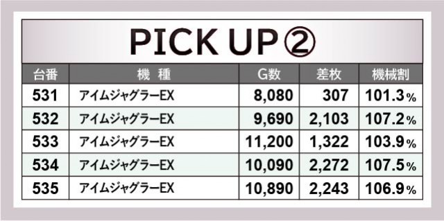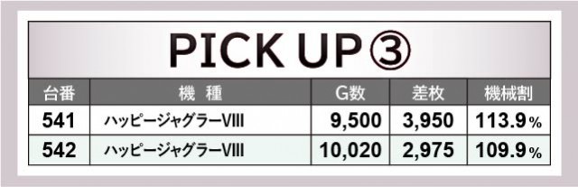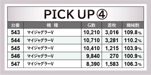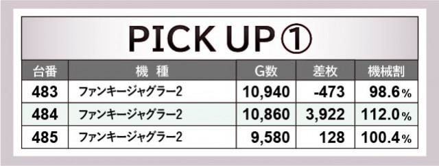 設置されている『ジャグラー』シリーズは、いずれも大きなポテンシャルを秘めいていた。『ファンキージャグラー2』484番台+3,922枚・『アイムジャグラーEX』534番台+2,272枚・『ハッピージャグラーVIII』541番台+3,950枚・『マイジャグラーV』544番台+3,281枚など、まとまった出玉を放出する台が珍しくなかったと言える。消化されたゲーム数からも、明らかな好感触が窺えるため、ファンは有意義な時間を過ごしていたはずだ。