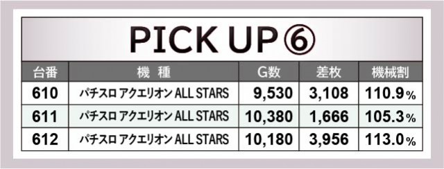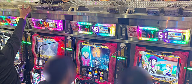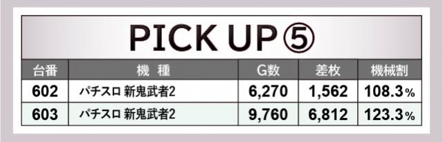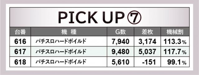 一方でAT機からは、『パチスロ 新鬼武者2』『パチスロ アクエリオン ALL STARS』『パチスロハードボイルド』が突出した活躍を披露。603番台+6,812枚が当日の最高記録を築けば、612番台+3,956枚・617番台+5,037枚など、追随するように熱気を放っていたのが印象的だ。こちらも全台が明らかな好感触で、やはりファンの満足度が高いエリアだったと言える。
