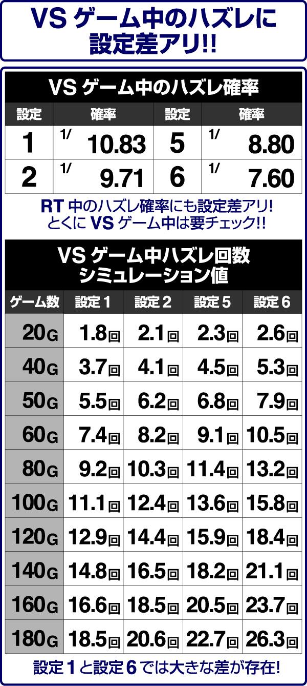 VSゲーム中のハズレ確率に設定差が設けられているため、実戦時はしっかりとチェックしておこう。