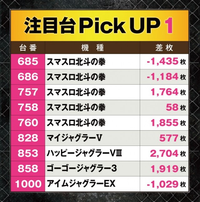 今回は『スマスロ北斗の拳』とジャグラーシリーズから好調台が誕生していたのが目に付いた。『ハッピージャグラーVⅢ』は+2,704枚と華麗なパフォーマンスを見せており、周囲の注目を集めていた。そのほか+1,000枚オーバーの台も幾つか見られたが、逆にマイナスとなってしまう台も多く、全体的な総差枚数に物足りなさを感じる結果となった。
