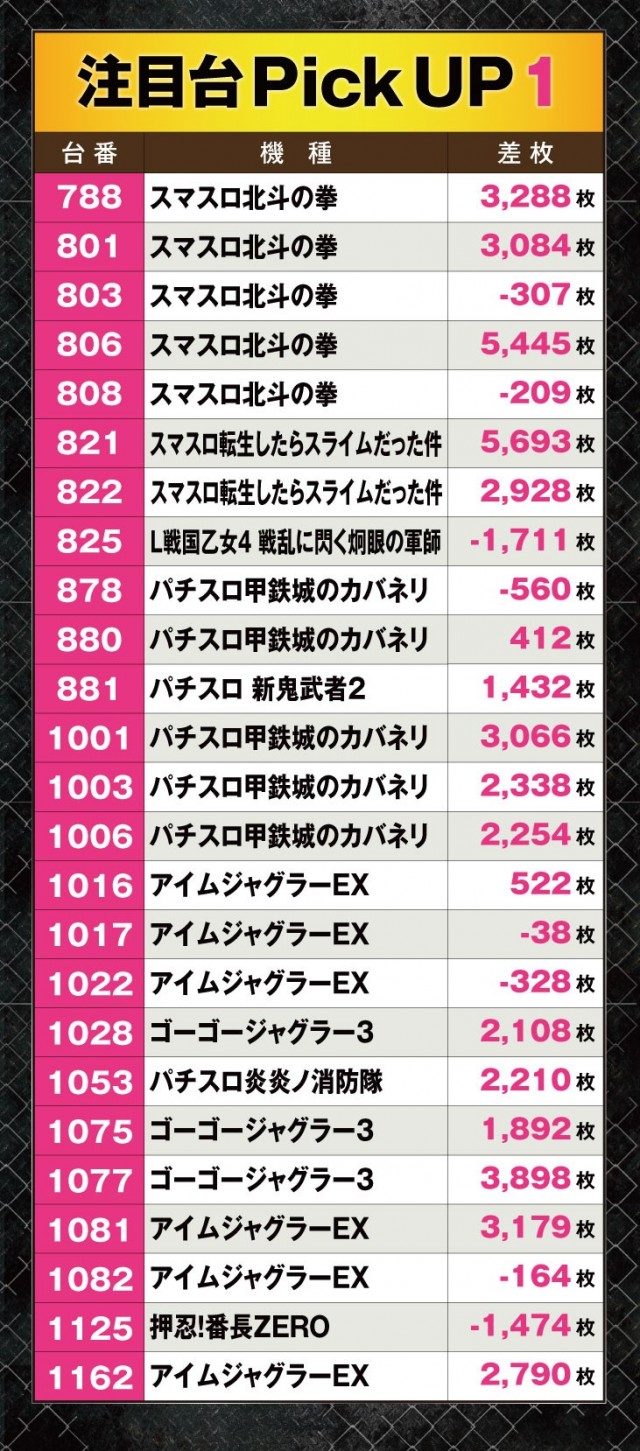 今回は店内の様々な機種から好調台が誕生していたのが目に付いた。特に『スマスロ北斗の拳』や『スマスロ転生したらスライムだった件』は+5,000枚オーバーと素晴らしい結果になっているのがわかる。ほかにも機種を問わず3,000枚オーバーの好調台が続出しており、多くのファンから笑顔がこぼれていた。