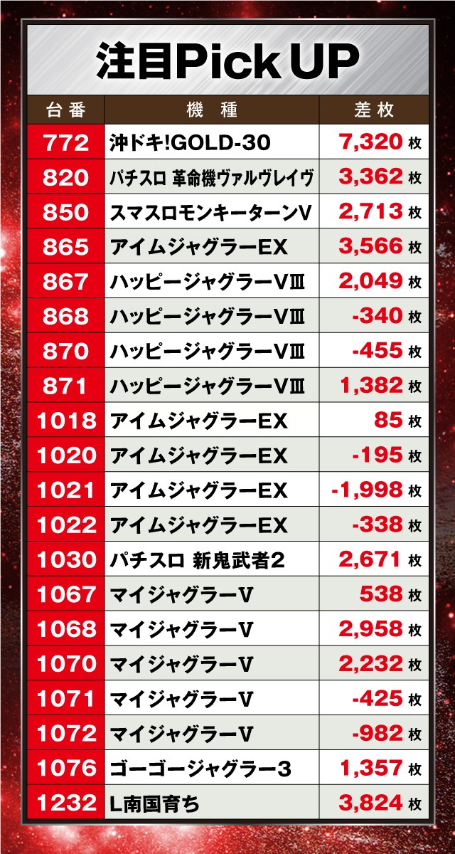 今回はジャグラーシリーズ・並びを中心に好調台が目に付く結果となった。次回降臨時は、ぜひあなたがチャンスを掴んでくれ!