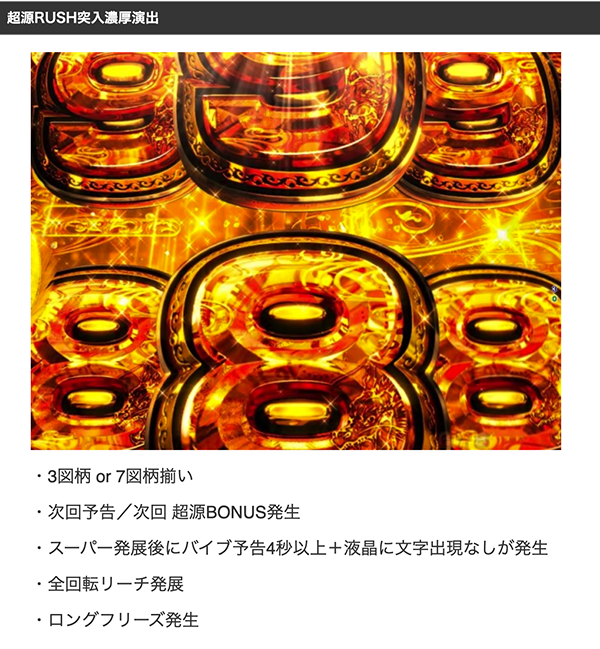 初当りの大当りラウンド中に発生する超源チャレンジ成功がRUSH獲得のメインルートとなっており、3図柄と7図柄揃いはRUSH突入濃厚だ。