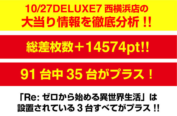 10月27日、「DELUXE 7西横浜店」のパチスロは91台中35台がプラス。