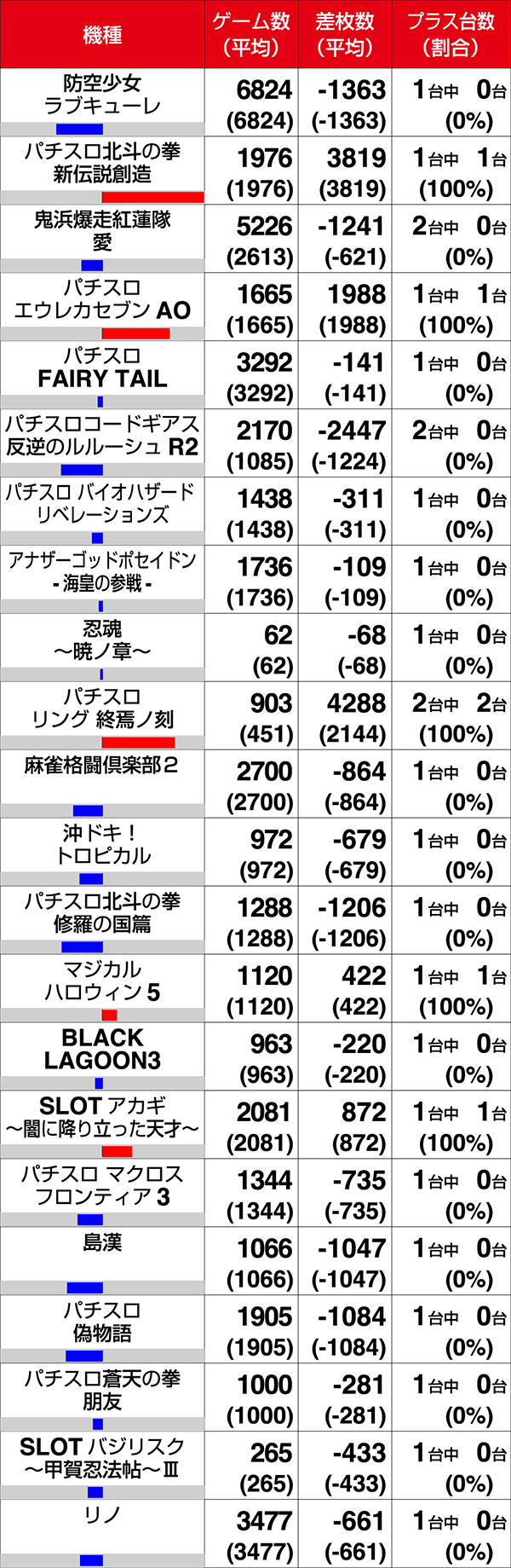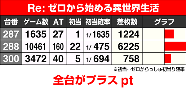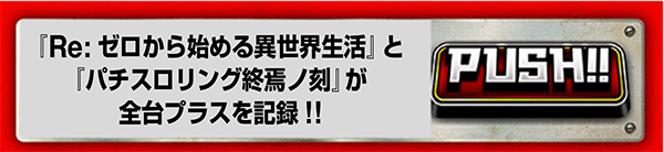 2台以上設置されている機種では『Re:ゼロから始める異世界生活』と『パチスロ リング 終焉ノ刻』が全台プラスとなった。