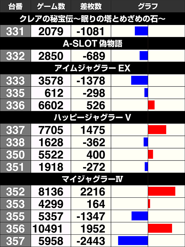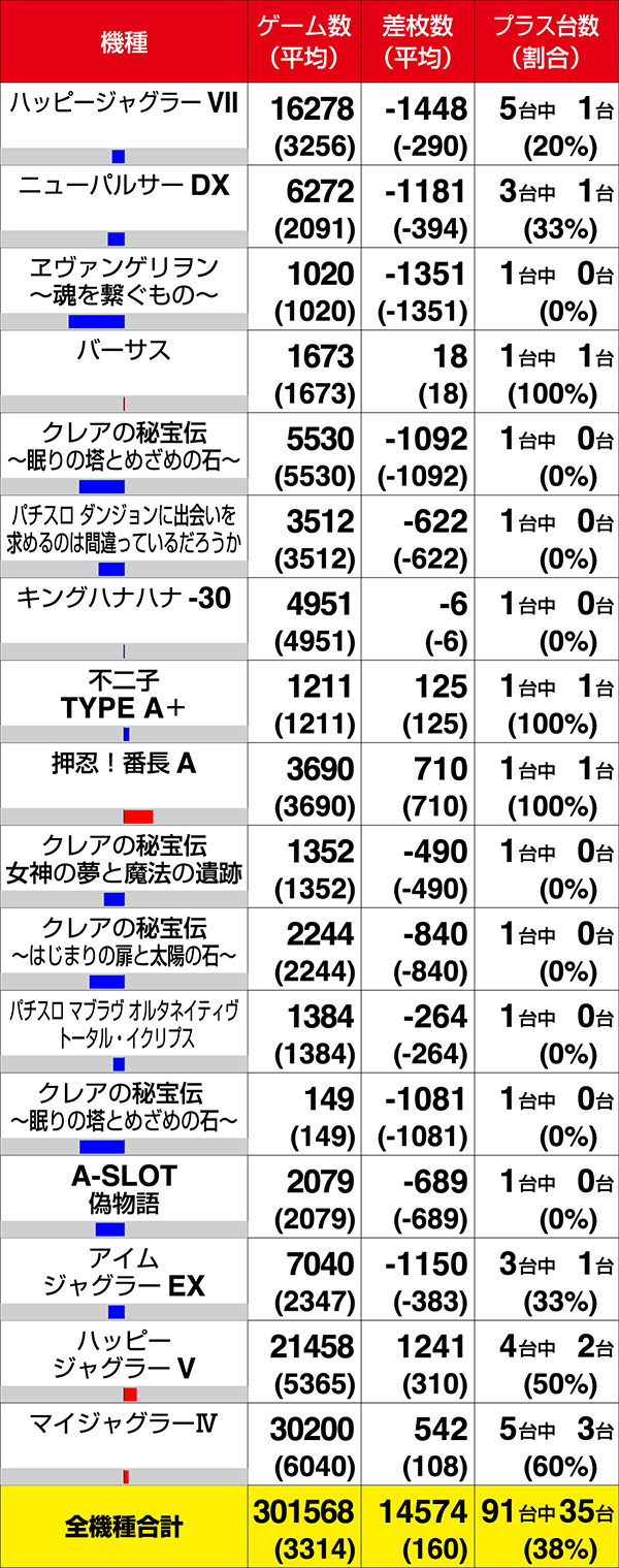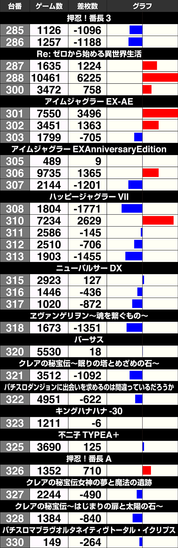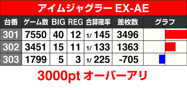 3台中2台がプラスを記録した『アイムジャグラーEX-AE』では、301番台は差枚数が3000ptを上回り、302番台はボーナス合算確率が1/133であった。