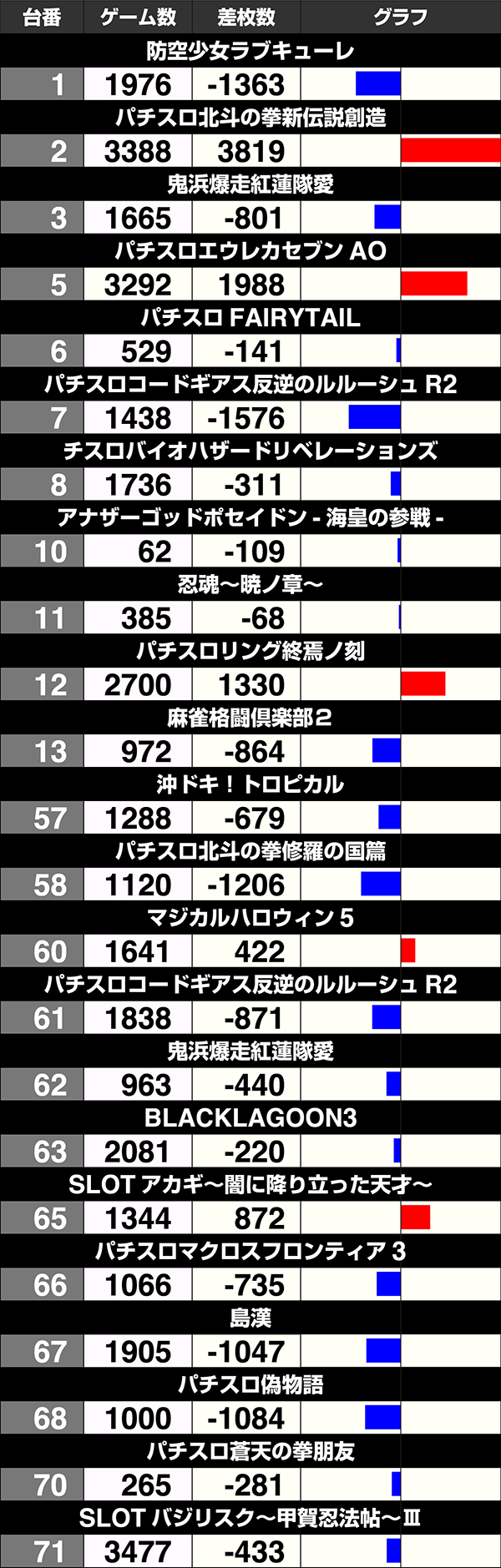 この日もっとも多かった差枚数は『パチスロ化物語』の6417pt。