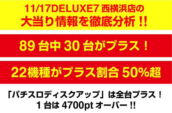 11月17日、「DELUXE 7西横浜店」のパチスロ全体では89台中30台がプラス。
