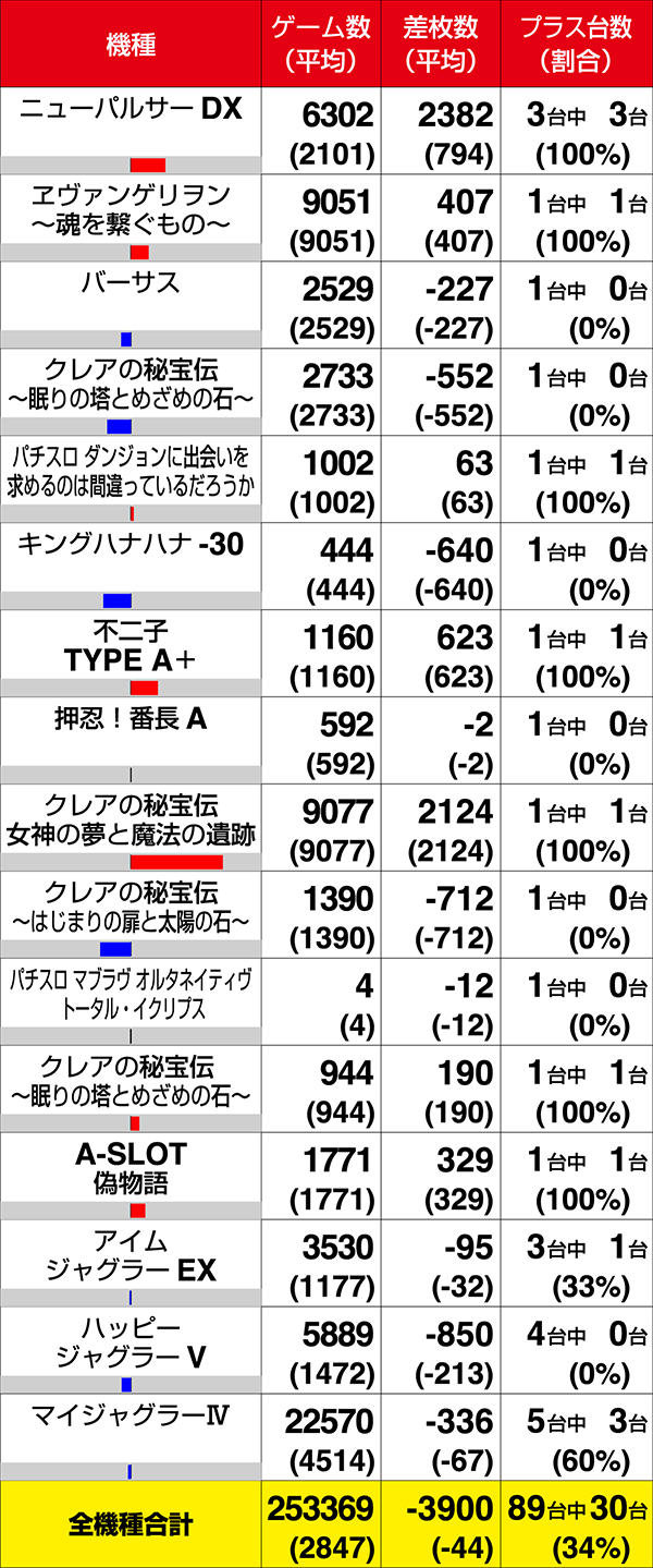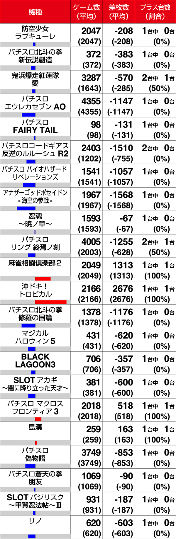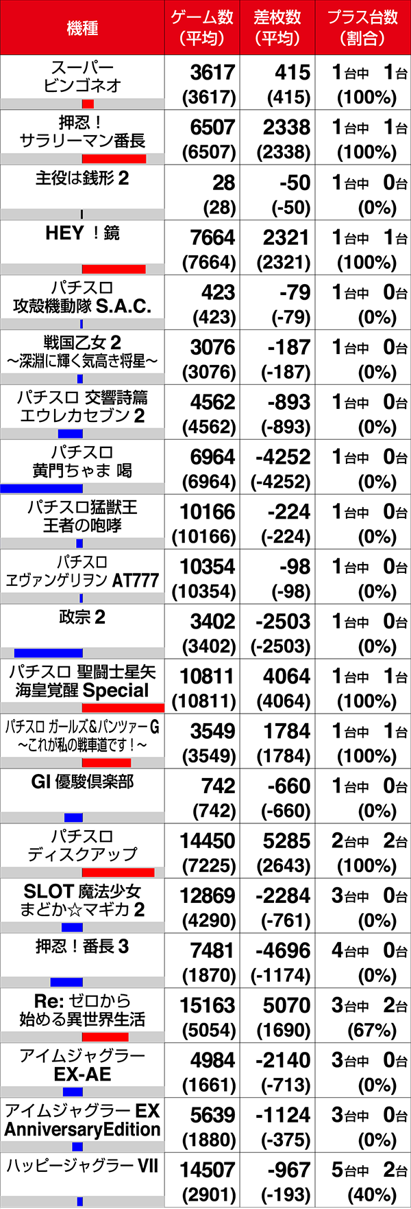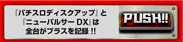 2台以上設置されている機種では、『パチスロディスクアップ』と『ニューパルサーデラックス』が全台プラスを記録した。
