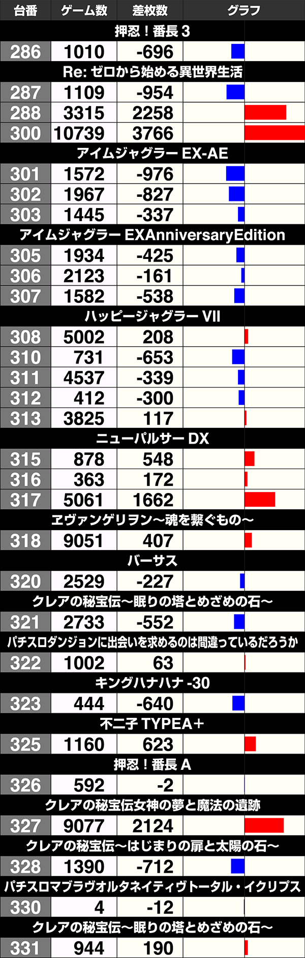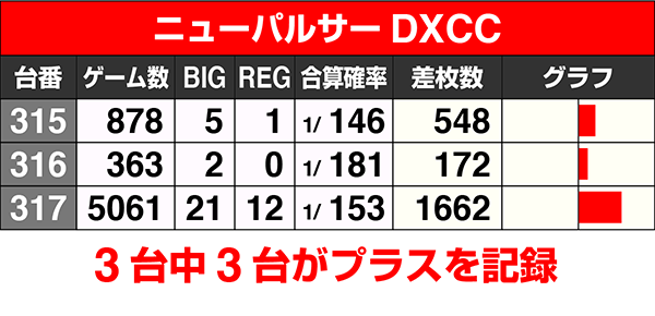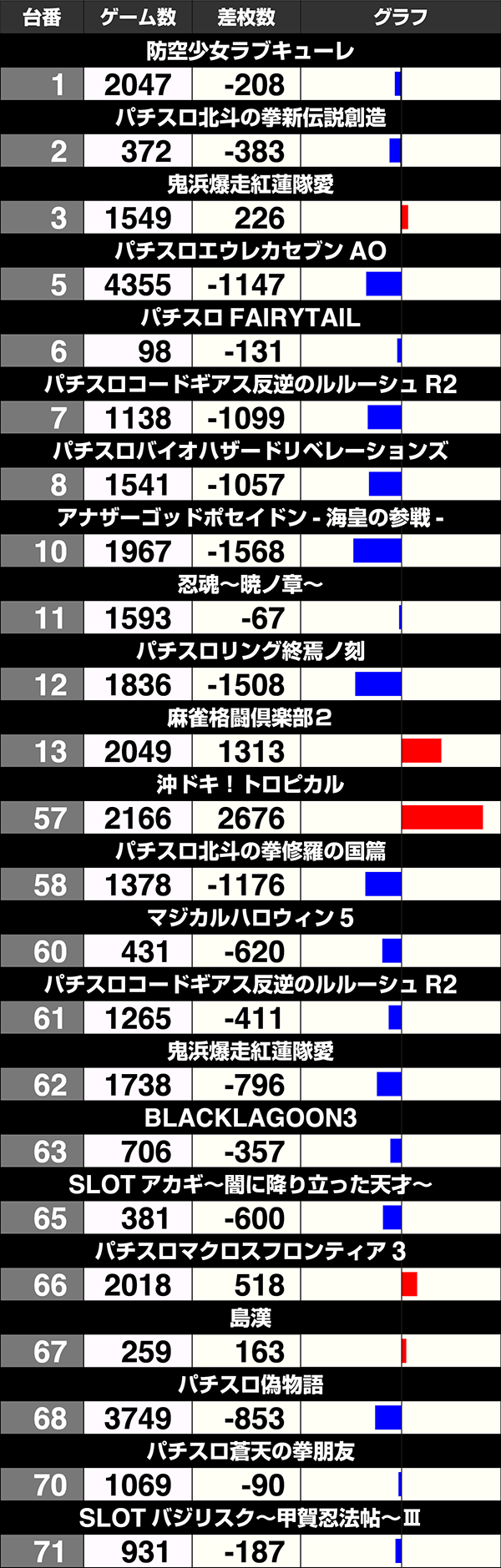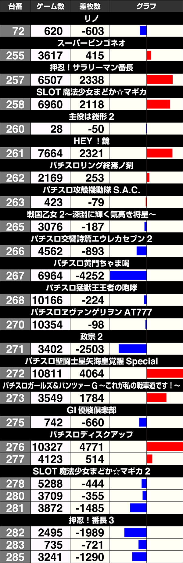 2台以上設置されている機種では、『パチスロディスクアップ』と『ニューパルサーデラックス』が全台プラスを記録した。