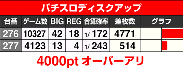 『パチスロディスクアップ』は2台がともにプラスで、そのうちの1台は4000ptを上回る好成績を記録した。