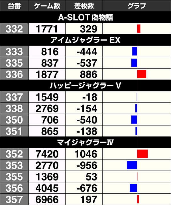 ジャグラーシリーズでは、『マイジャグラーⅣ』が5台中3台がプラスを記録した。