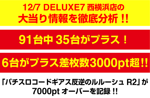12月7日の「DELUXE 7西横浜店」は、パチスロ全体で91台中35台がプラス。