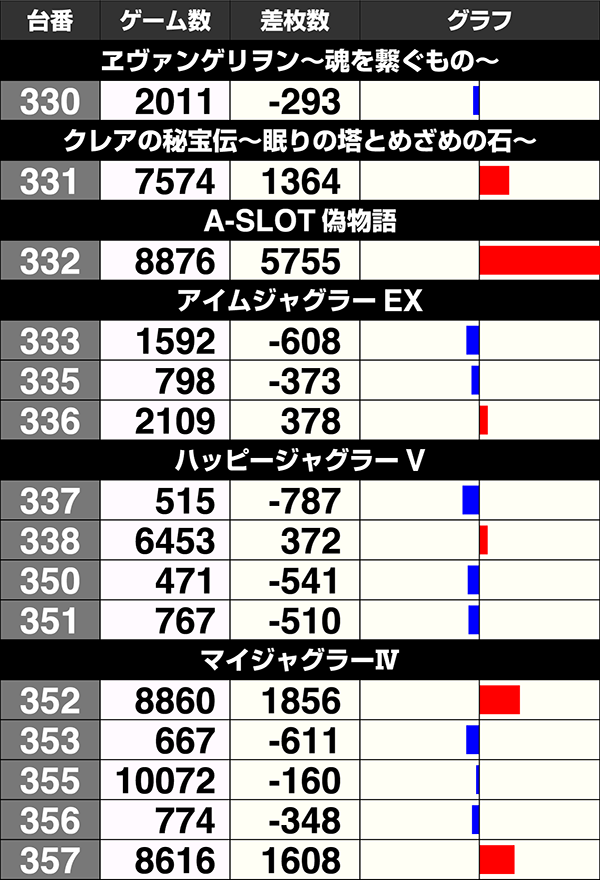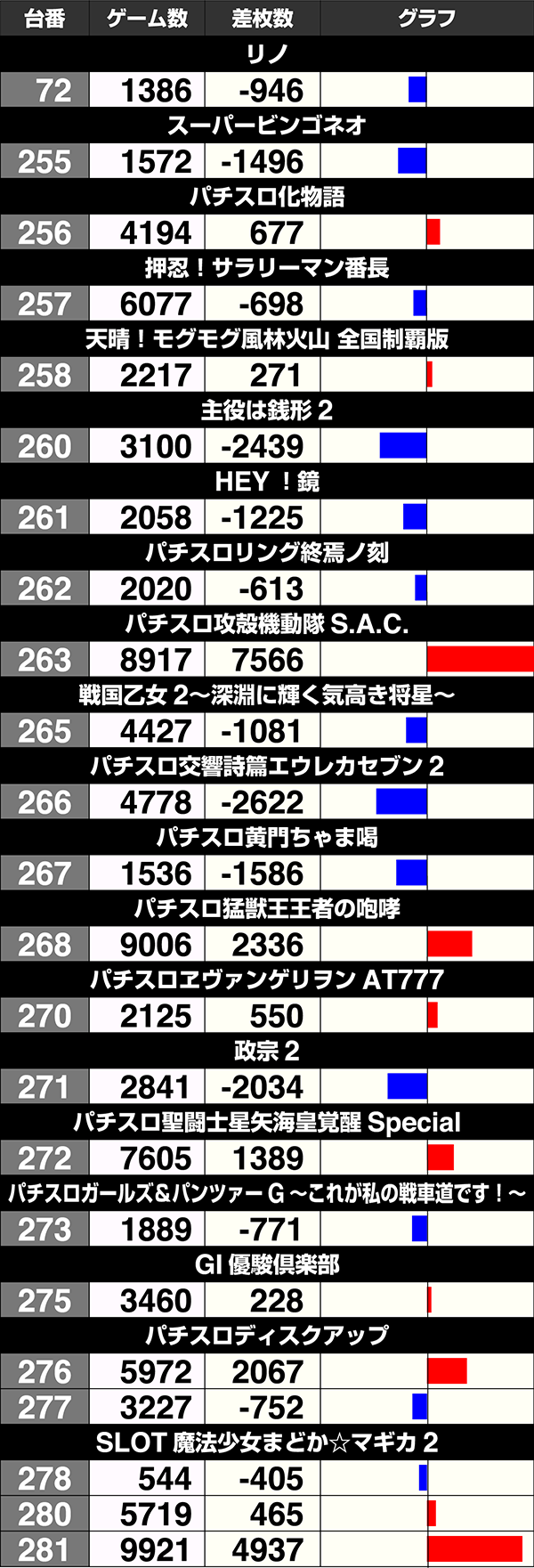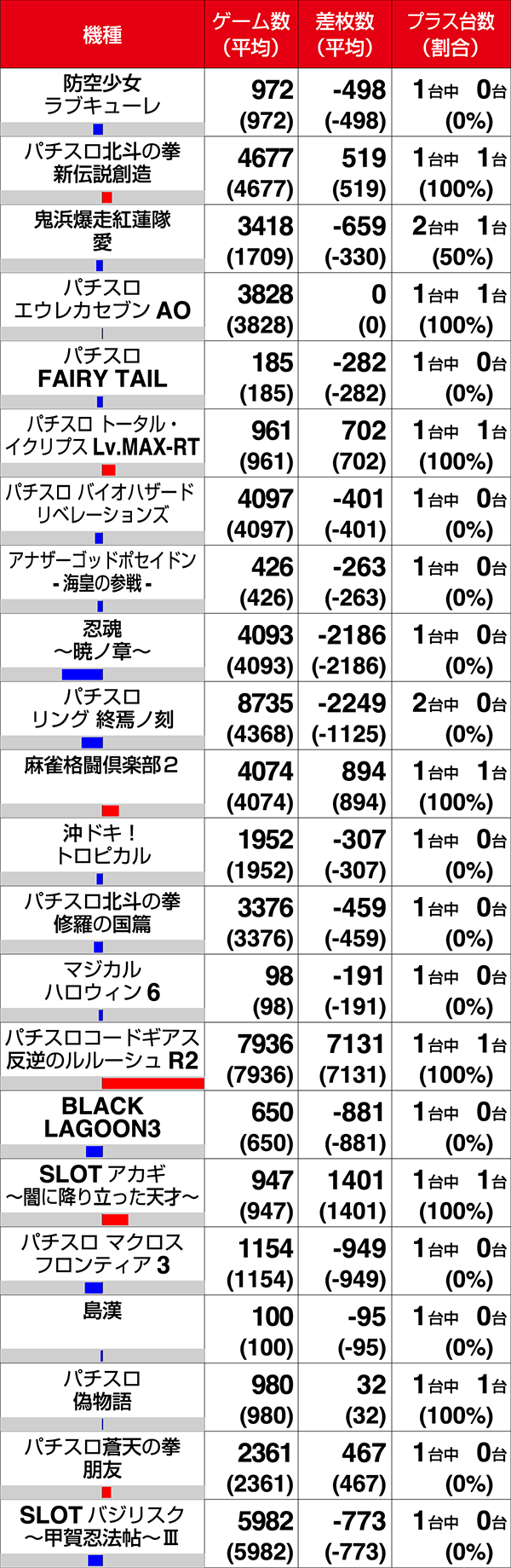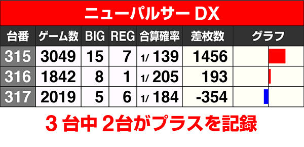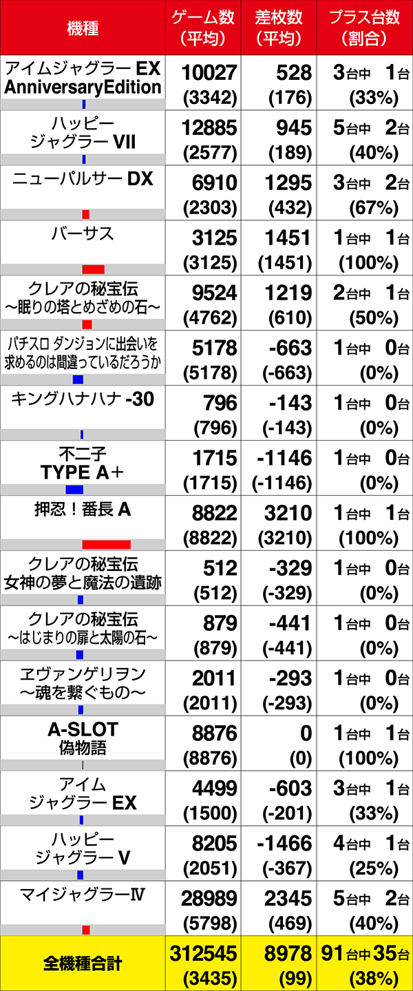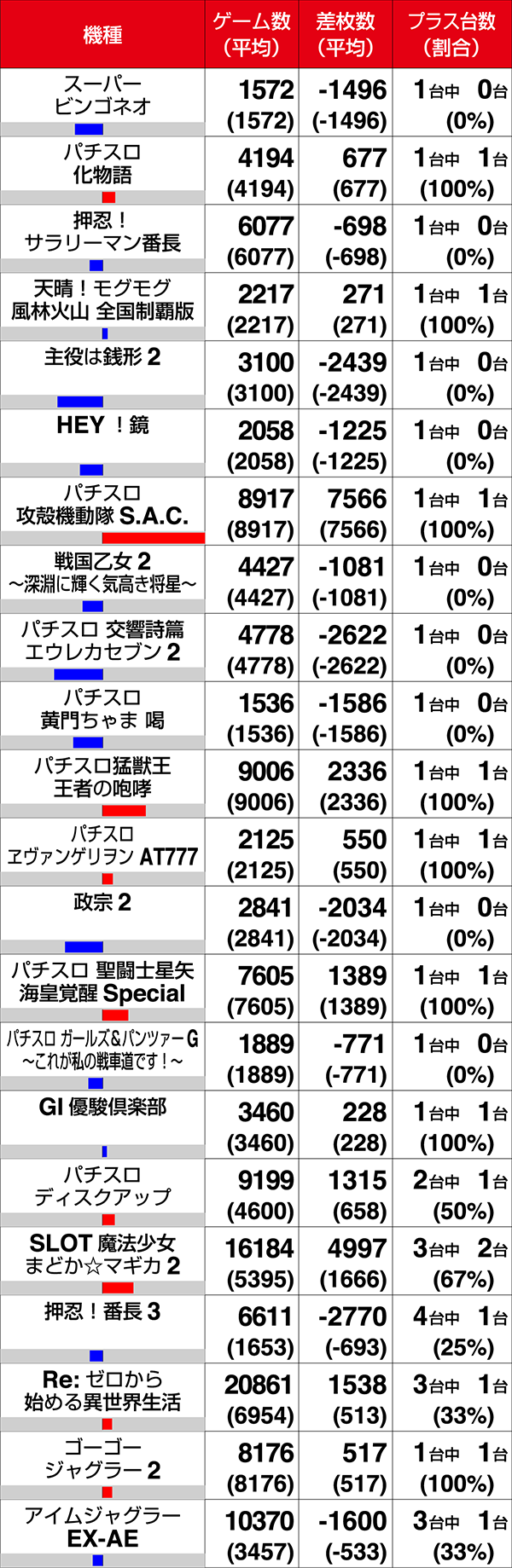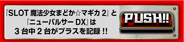 『SLOT魔法少女まどか☆マギカ2』と『ニューパルサーデラックス』はともに3台中2台がプラス。