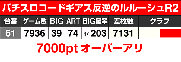 『パチスロコードギアス反逆のルルーシュR2』は8000G目前まで遊ばれており、差枚数はプラス7000ptを上回った。