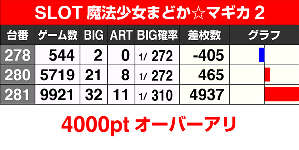 『SLOT魔法少女まどか☆マギカ2』は5000Gを超えて稼働していた台はどちらもプラスで、4000ptを上回るデータもあった。