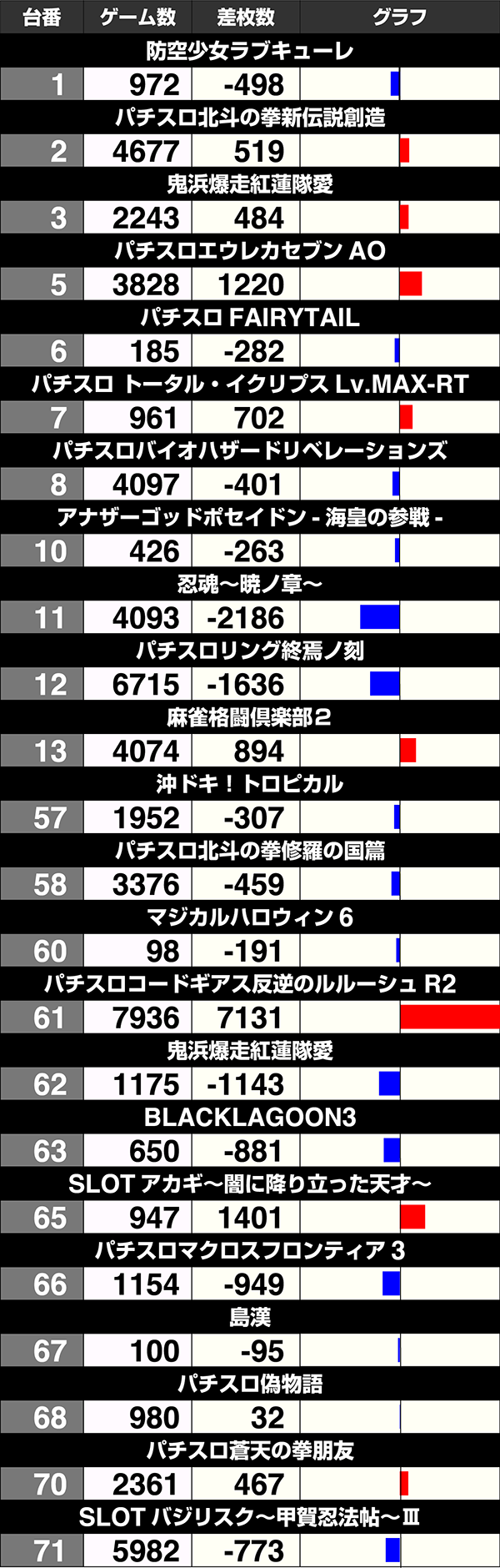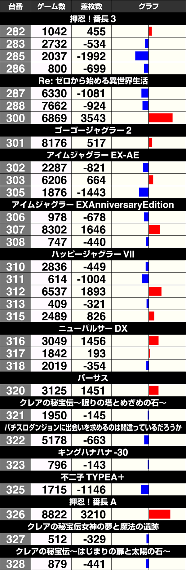 6号機では3500ptオーバー記録した『Re:ゼロから始める異世界生活』をはじめ、『パチスロ猛獣王 王者の咆哮』や『パチスロ蒼天の拳 朋友』がプラスであった。