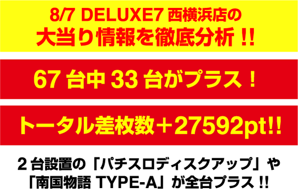 8月7日の「DELUXE 7西横浜店」は、20円パチスロコーナーの約半数の台がプラスであった。