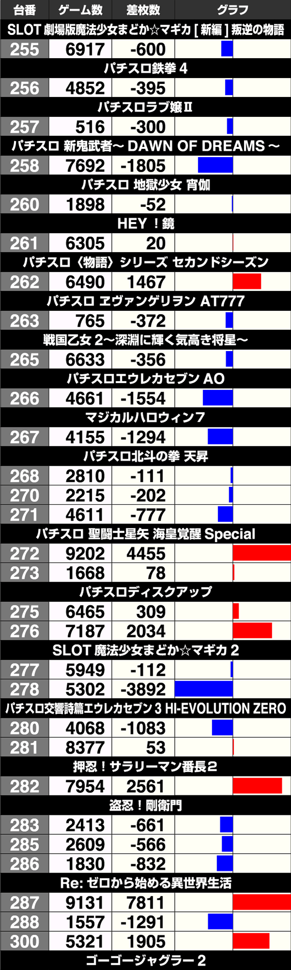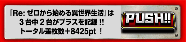 3台設置の『Re:ゼロから始める異世界生活』は3台中2台がプラスで、287番台はこの日トップとなる+7811ptを記録した。