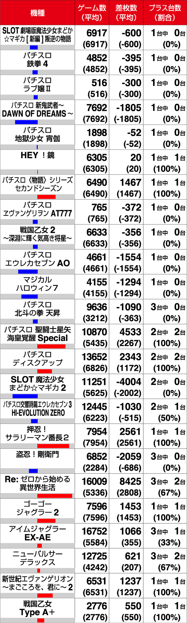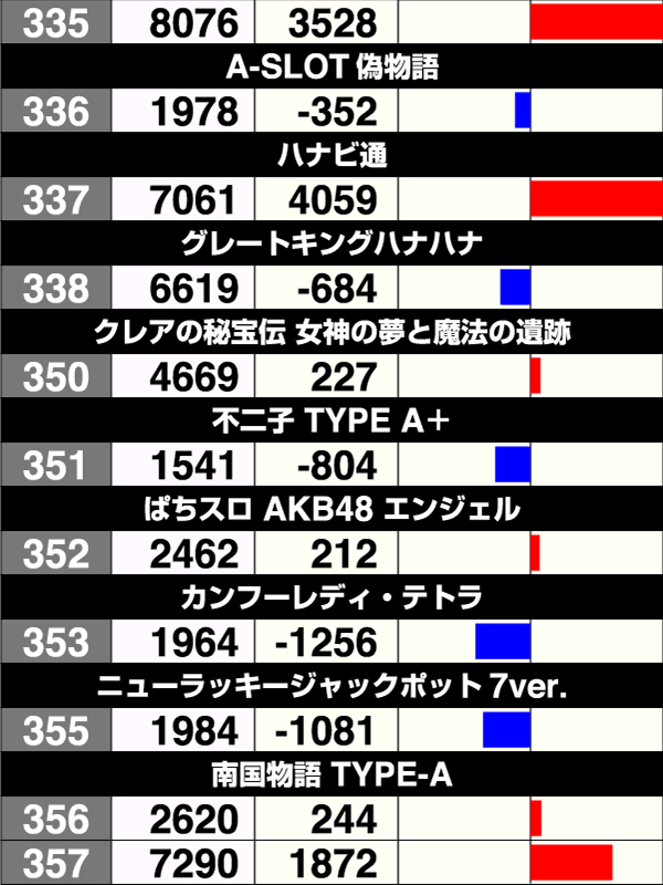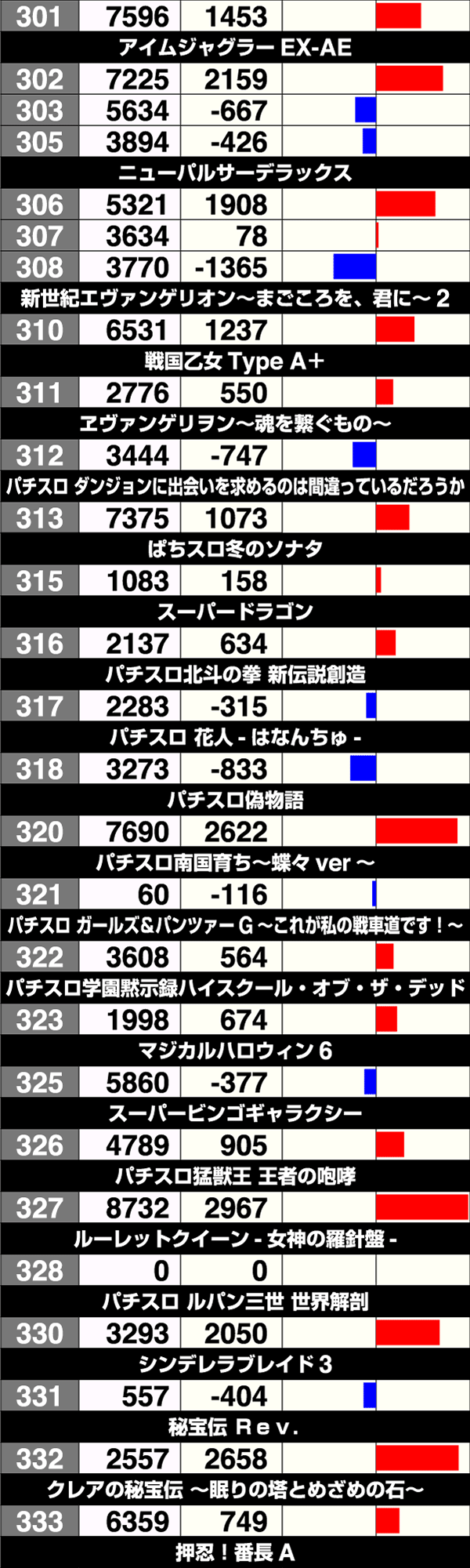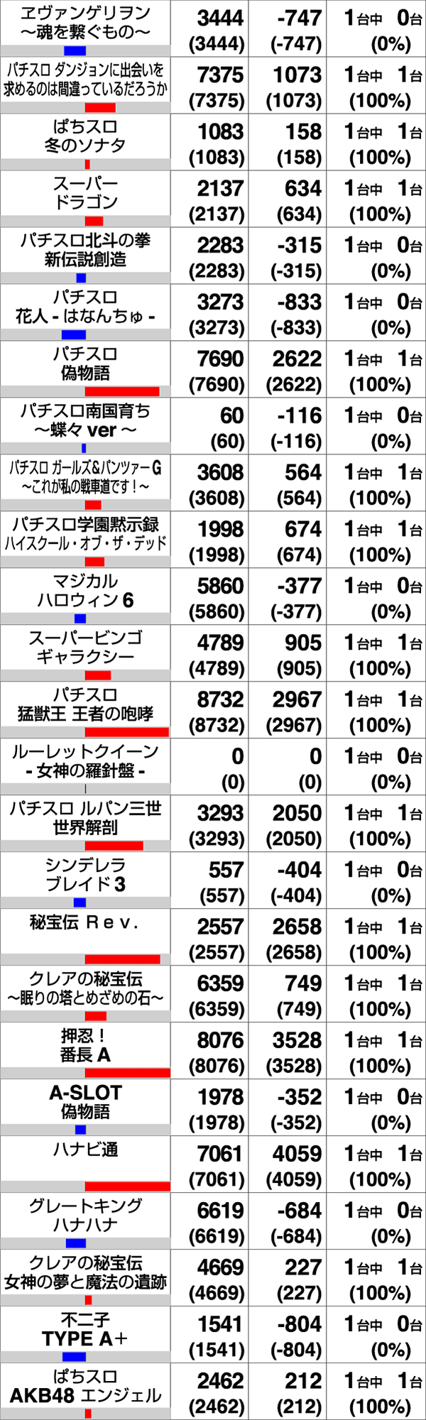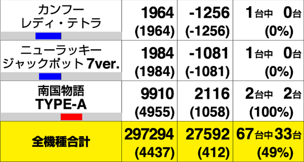 3台中2台がプラスの『ニューパルサーデラックス』や2台がともにプラスの『南国物語 TYPE-A』など、ボーナスタイプにもプラス台が目立った。