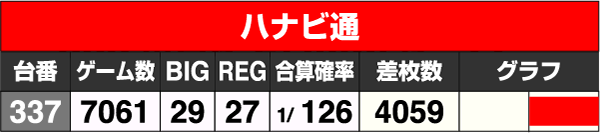 プラス4000ptオーバーを記録した『ハナビ通』のボーナス合算確率は、設定6の数値を上回る1/126であった。