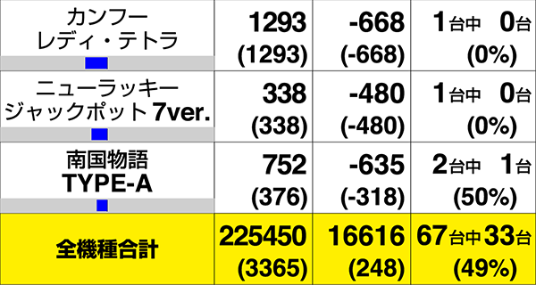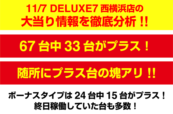 11月7日、「DELUXE 7西横浜店」の20円パチスロは約半数の33台がプラスで、合計差枚数は+16616pt。