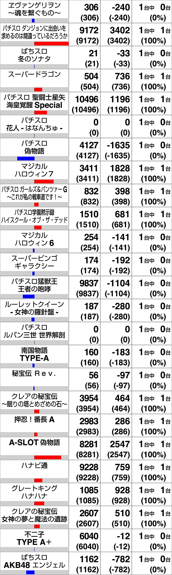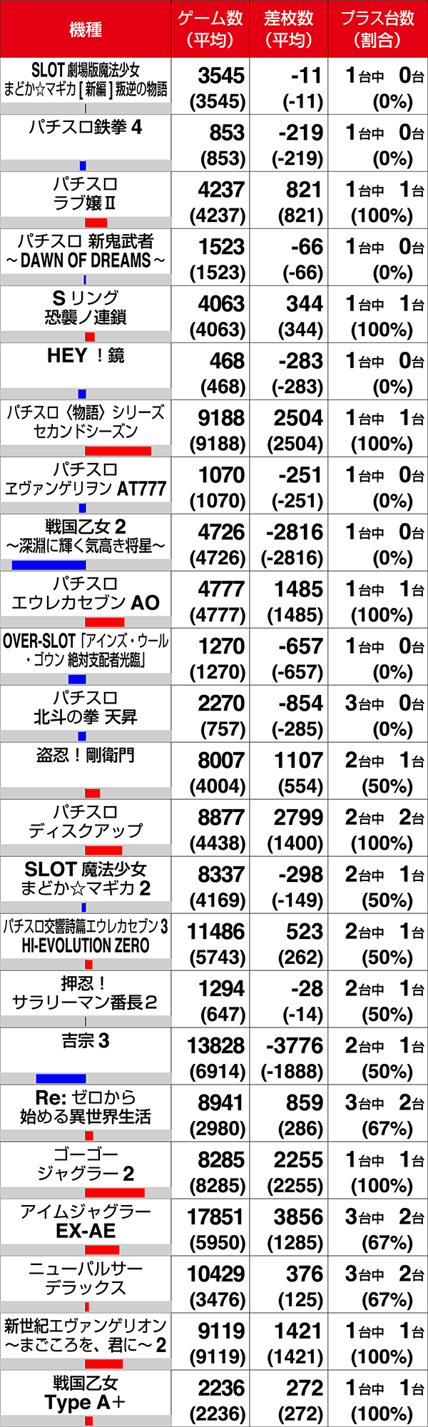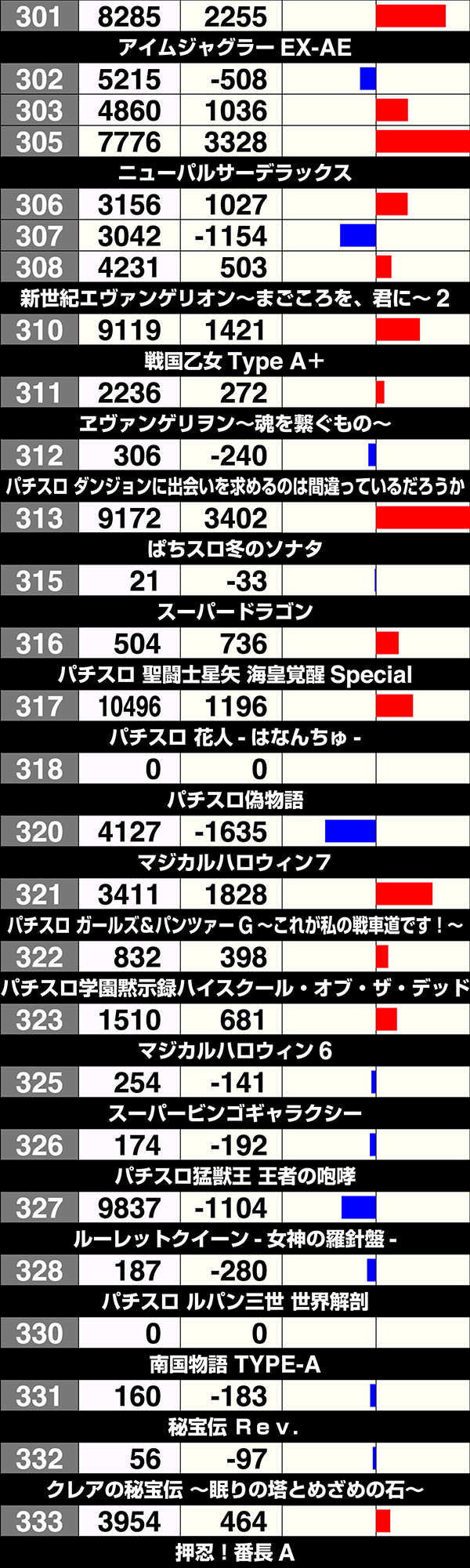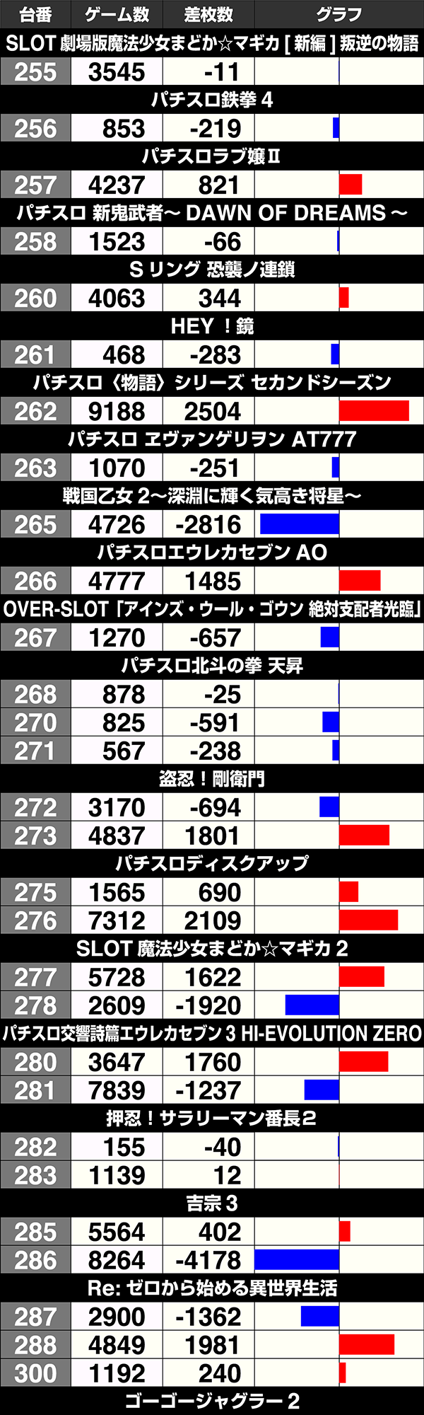 281番台の『パチスロ交響詩篇エウレカセブン3 HI-EVOLUTION ZERO』と327番台の『パチスロ猛獣王 王者の咆哮』は最終的な結果こそ残せなかったが、ゲーム数から魅力的な要素があったことがうかがえる。展開がひとつ変われば、まったく異なる差枚となったのではないだろうか。