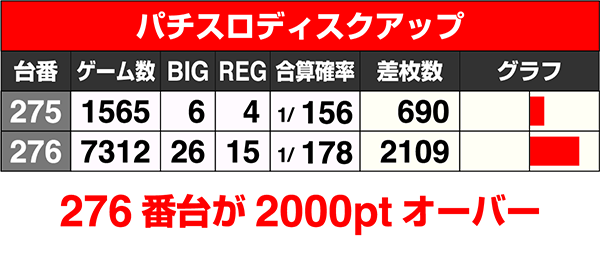 『パチスロディスクアップ』は2台がともにプラスで、276番台は+2000ptオーバー。