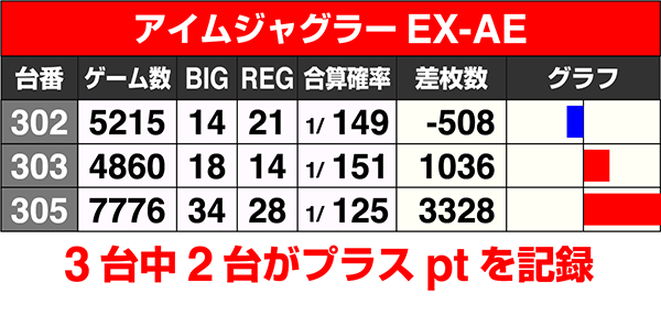 3台中2台がプラスの『アイムジャグラーEX-AE』は、305番台のボーナス合算確率が1/130を上回った。