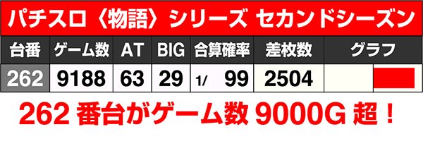 『パチスロ ダンジョンに出会いを求めるのは間違っているだろうか』や『パチスロ〈物語〉シリーズ セカンドシーズン』はゲーム数9000G超。どちらも差枚数は2500ptを超えた。