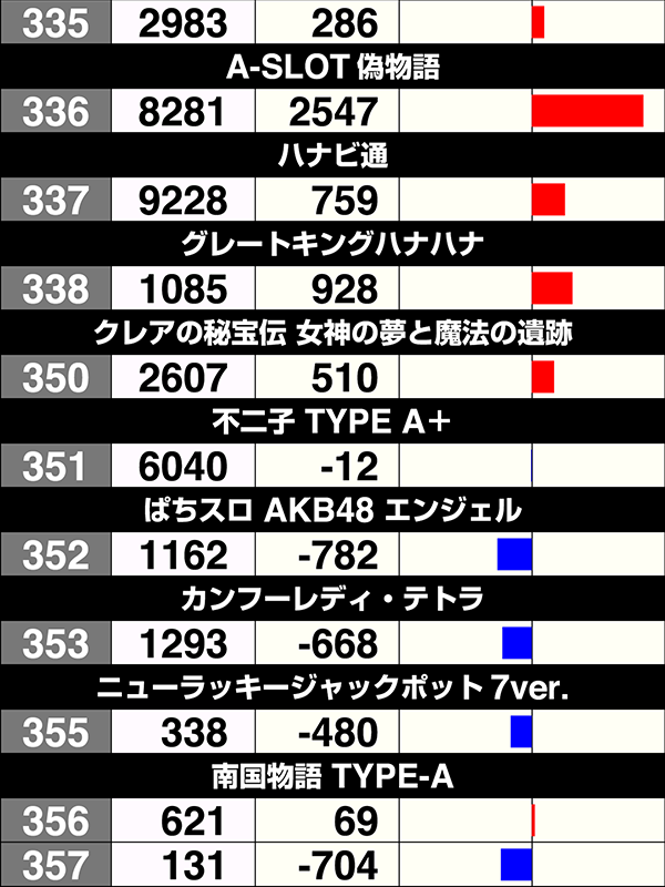 336番台の『A-SLOT偽物語』や301番台の『ゴーゴージャグラー2』などをはじめ、ボーナスタイプは全体の6割以上がプラスの好成績を残した。