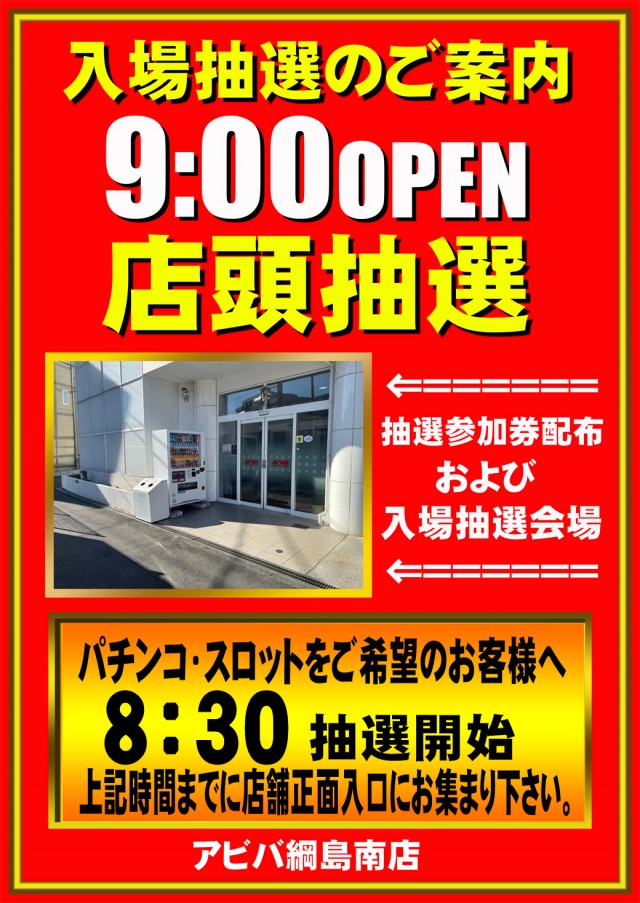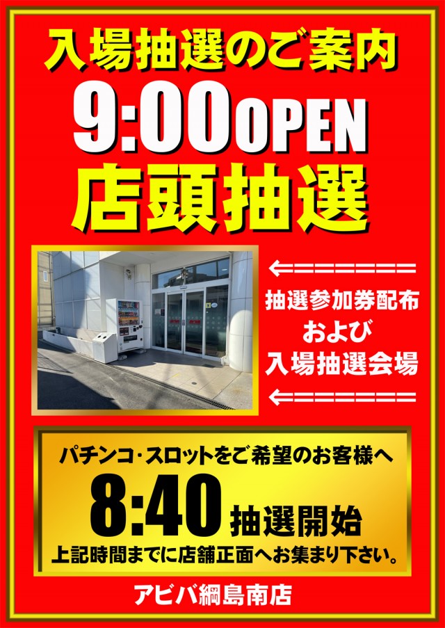 抽選場所:店舗正面入口前 抽選時間 通常日➡8:40抽選開始 1日・11日・21日➡8:30抽選開始 |