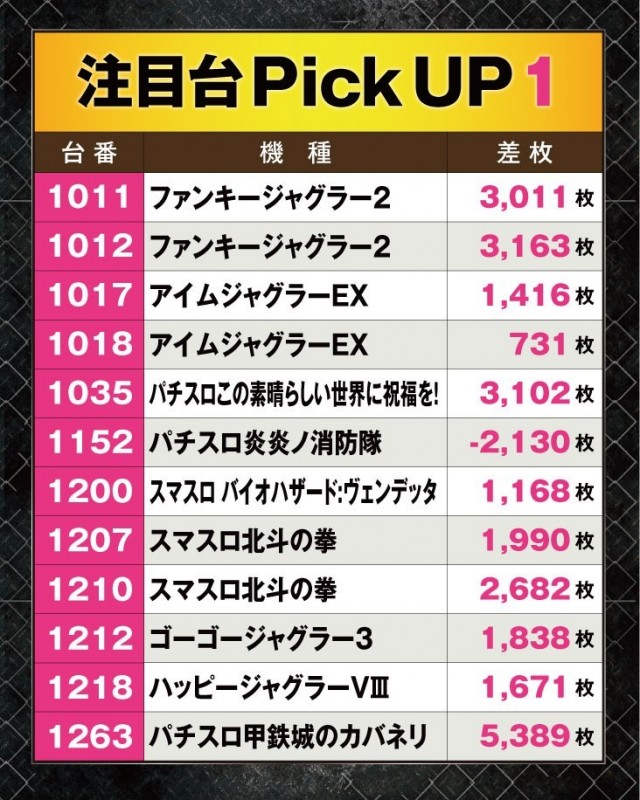 もちろんそれだけではない。『ファンキージャグラー2』や『アイムジャグラーEX』は2台並びで好調台が誕生するほか、『パチスロこの素晴らしい世界に祝福を!』や『スマスロ北斗の拳』なども絶好調で、機種を問わず見事な活躍を披露していた。