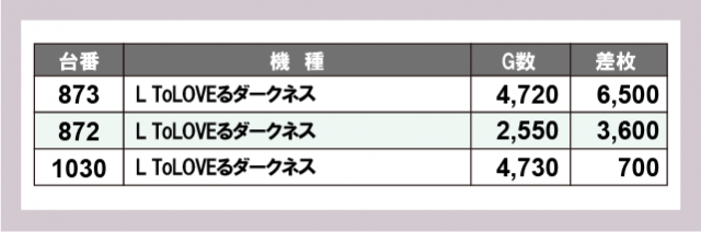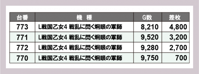 なかでも目を引いたのは、塊を意識した好調箇所の存在だ。『スマスロ 化物語』は、ほぼ全台が8,000G~10,000G超の稼働を記録。差枚の明暗を超えて、機種そのものが信頼されて打ち込まれていた状況が見て取れる。加えて、『パチスロ からくりサーカス』『L戦国乙女4 戦乱に閃く炯眼の軍師』『L ToLOVEるダークネス』『Lパチスロ 革命機ヴァルヴレイヴ2』など、機種単位で可能性を感じさせる箇所も随所に確認でき、ファンの熱意と期待感が数字に直結した一日となった!この勢いを体感したら、次回開催にも期待せずにはいられない。
