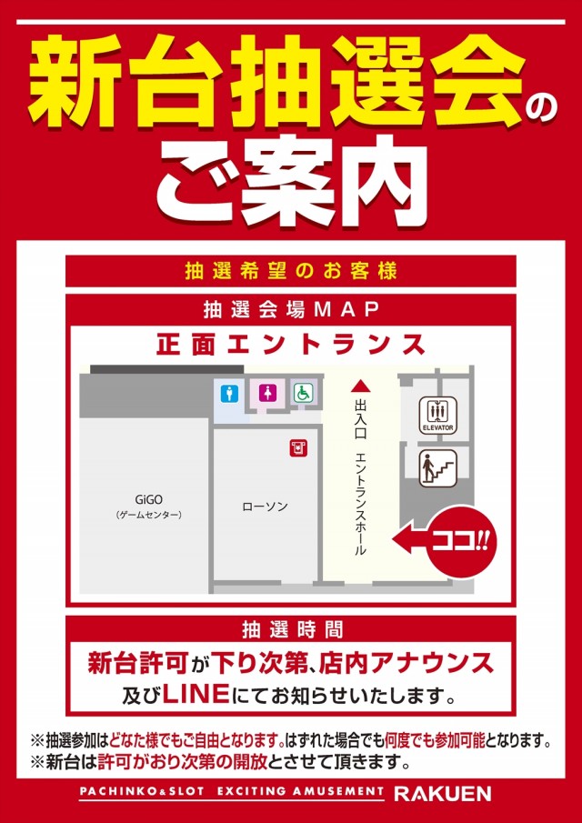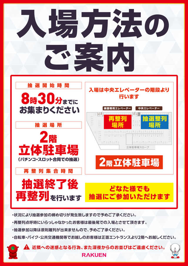 通常は8:30までにお並び頂いたお客様で2階立体駐車場にてパチンコ・スロット合同での抽選 |