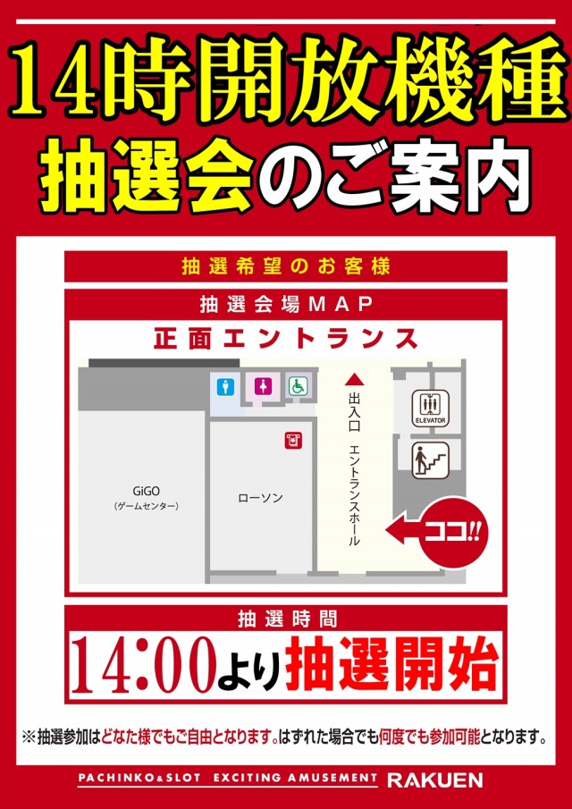 通常は8:30までにお並び頂いたお客様で2階立体駐車場にてパチンコ・スロット合同での抽選 |