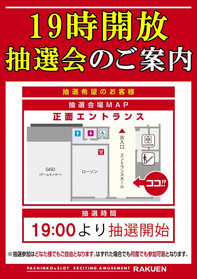 通常は8:30までにお並び頂いたお客様で2階立体駐車場にてパチンコ・スロット合同での抽選 |